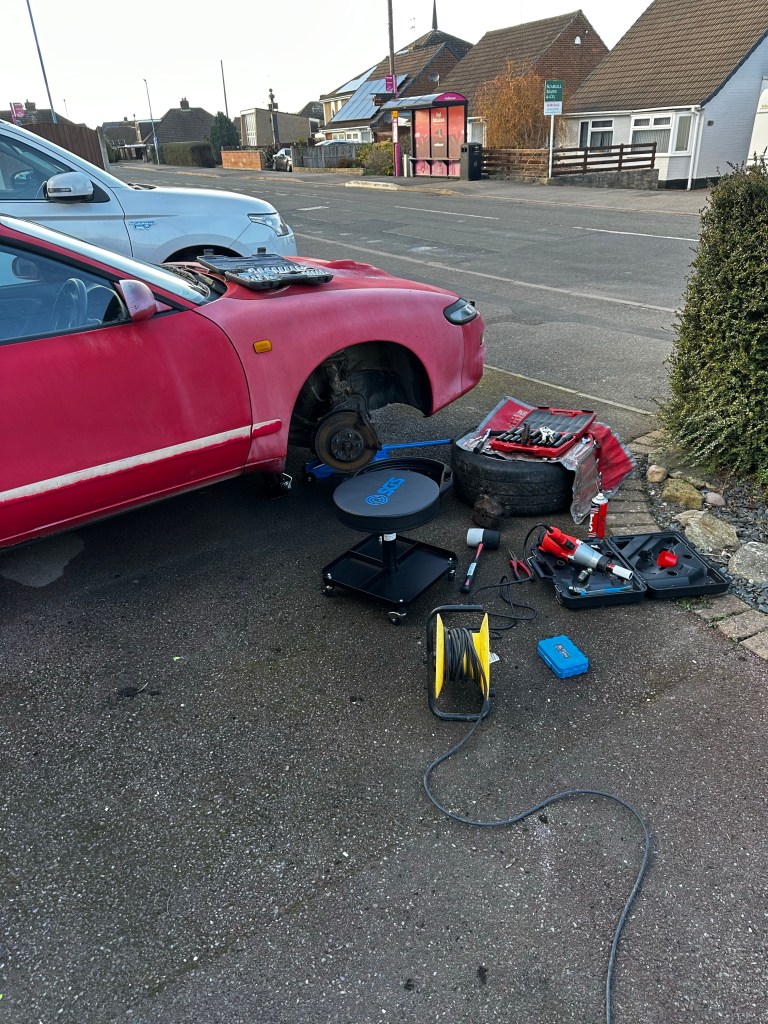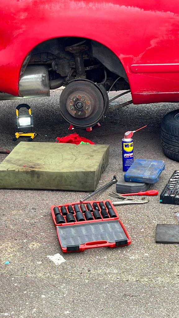 This week we have taken the brakes off so we can move the car. It has been stood so long it had seized. Dad put the car on axle stands to make it safe and so we could look underneath.